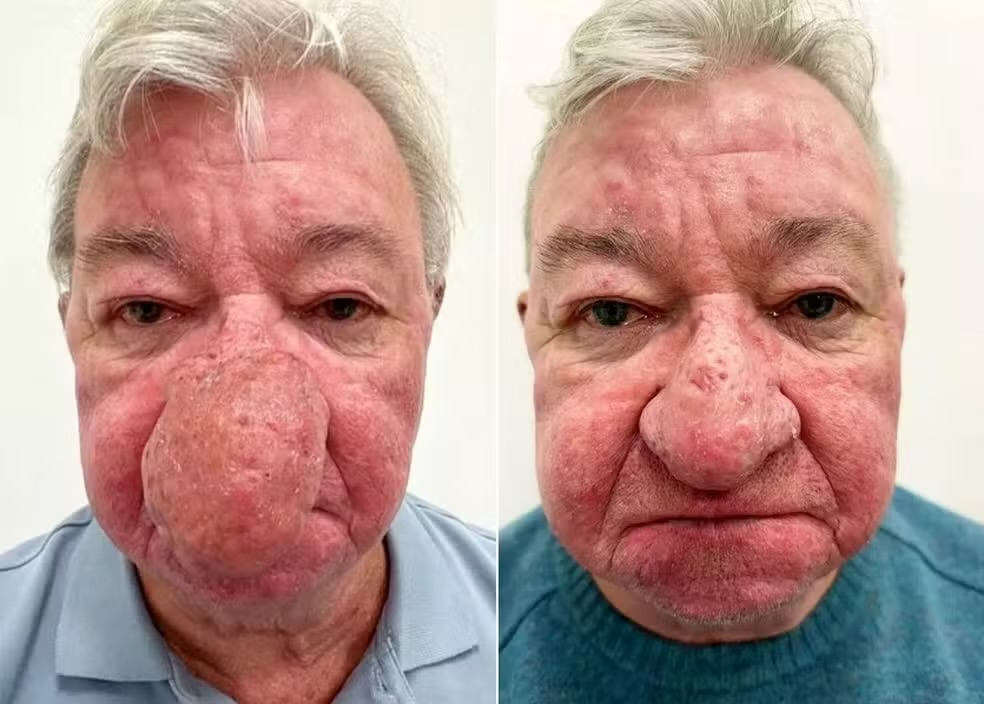 Um escocês de 68 anos que ficou impossibilitado de beijar a própria esposa devido ao crescimento anormal do nariz passou por uma cirurgia reconstrutiva que transformou sua vida. Gerard McAliece, morador de Kilmalcolm, na Escócia, enfrentava um dos casos mais graves de rinofima já vistos por médicos no Reino Unido. A condição é desencadeada pela multiplicação das glândulas sebáceas no nariz e no tecido conjuntivo, causando inchaço, vermelhidão e deformação.